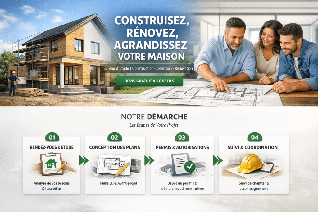 Vous avez un projet de construction, dâextension ou de rĂ©novationâŻ? Je vous accompagne avec une expertise technique complĂšte, depuis la conception jusquâĂ lâobtention des autorisations administratives, dans le strict respect des rĂ©glementations en vigueur.